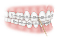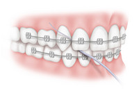 Ablagerungen an den Drähten lassen sich gut mit Interdentalbürstchen entfernen. Dazu wird das Bürstchen unter den Draht geschoben und mehrfach von oben nach unten gezogen.